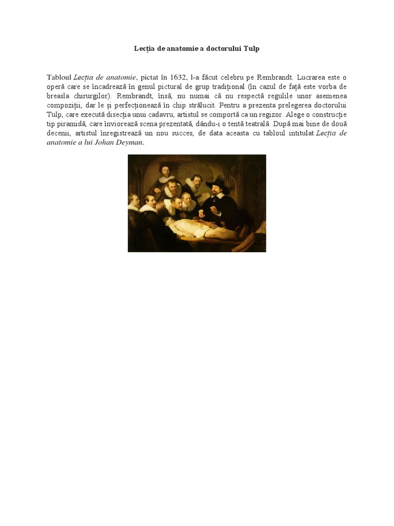 Lecția De Anatomie A Dr Tulp De Rembrandt Emblemă A Anatomiei Moderne