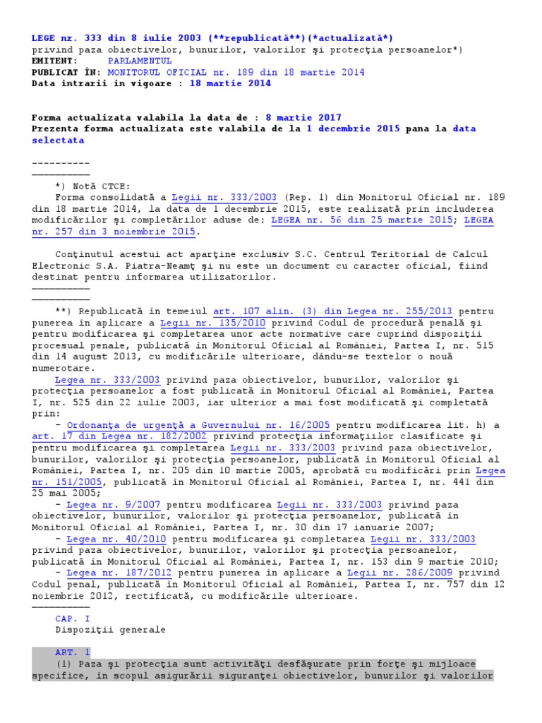 Lege Nr 333 Din 8 Iulie 2003 Actualizată Privind Paza Obiectivelor Bunurilor Valorilor Si Protecţia Persoanelor Actua